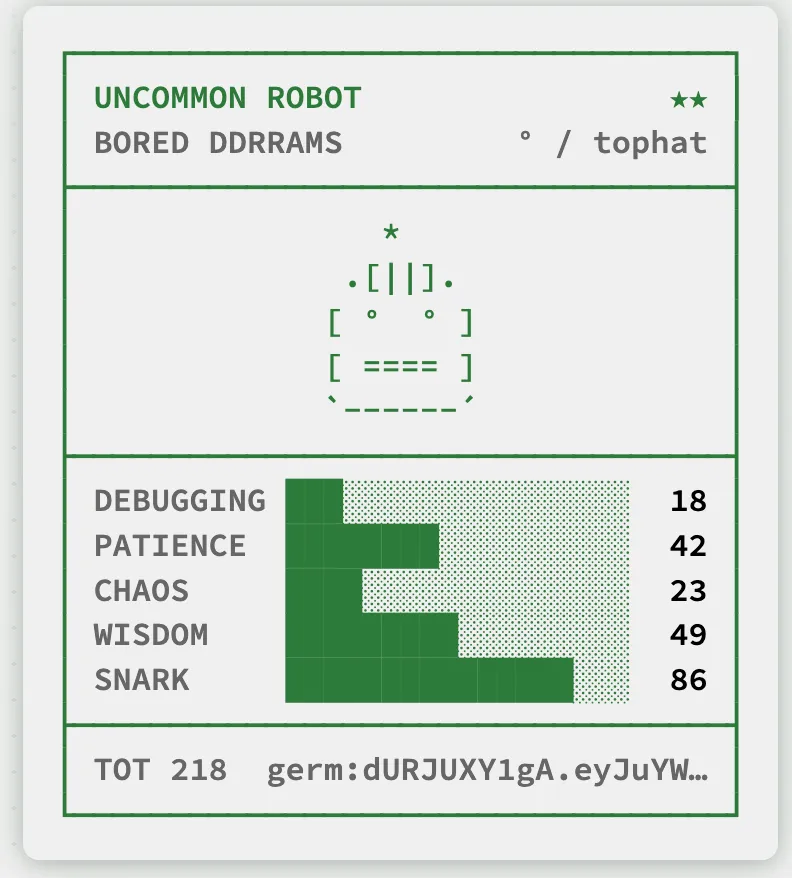 But m my favorite is Anthropic’s upcoming April Fool’s Day project: buddies. You run /buddy in Claude Code and a little ASCII friend is generated for you. He has a name, a personality, some stats, a species, a hat, some eyes, and a rarity. they can even be shiny, just like Pokémon.